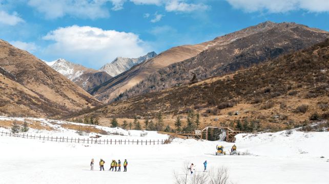 ▲ 褐黄色的山尖顶着凉雪,雪坡上的木栅栏歪歪扭扭地圈着场地。穿荧光背心的人凑成小群,远处的造雪机吐着白,连风里都飘着雪沫的细碎声响
