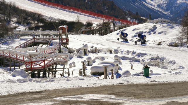 ▲ 红漆步道盖着薄雪,造雪机蹲在雪坡旁吐着白絮,木桩子裹着雪堆成圆滚滚的模样。路面漏出点潮湿的黑,冷冽的风里,连空气都浸着雪的清寒