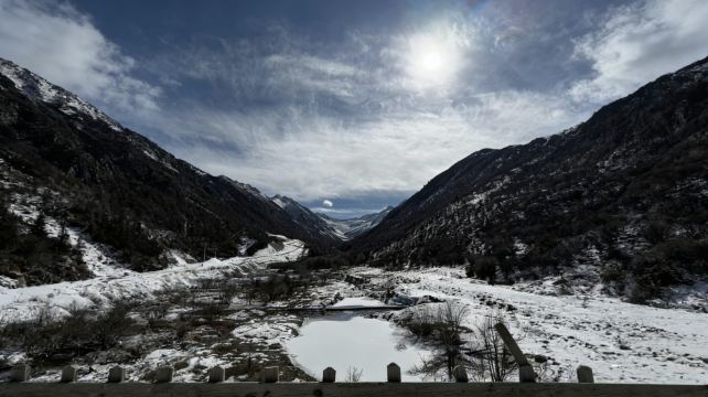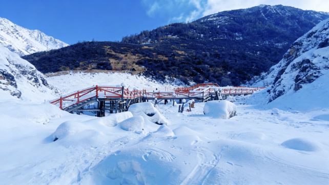 ▲ 雪山夹着窄窄的谷,云絮在蓝天里扯得松散,冻住的水潭像块碎冰嵌在雪地里。蜿蜒的路往山深处钻,风裹着雪粒扫过枯树,连寂静都带着旷野的凛冽