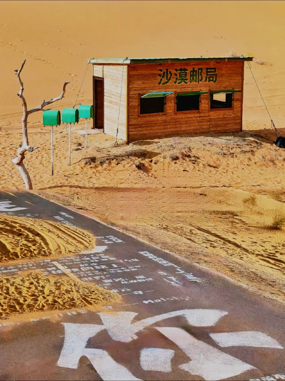 ▲ 在腾格里沙漠腹地,一座白色邮局静立沙海之间。驼铃与风声在此交织,明信片上的墨香晕染着大漠的苍茫。这里是时光的驿站,让每一封信都裹着星光与流沙,寄向远方,将荒芜与浪漫化作温柔的牵挂。
