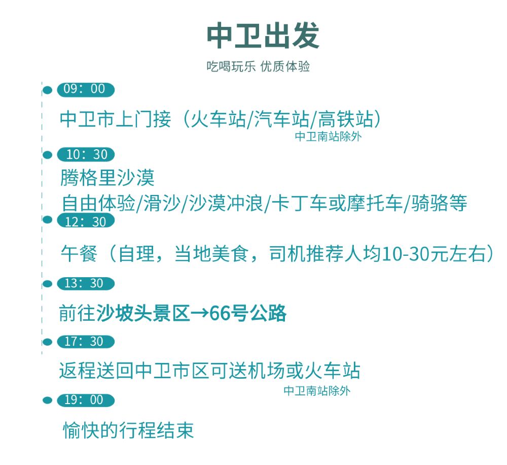宁夏中卫腾格里沙漠+沙坡头+66号一日游【市区接送/纯玩】【【全心为您服务】纯玩服务,无购物,本地专业车队,银川市区免费上门接送。】