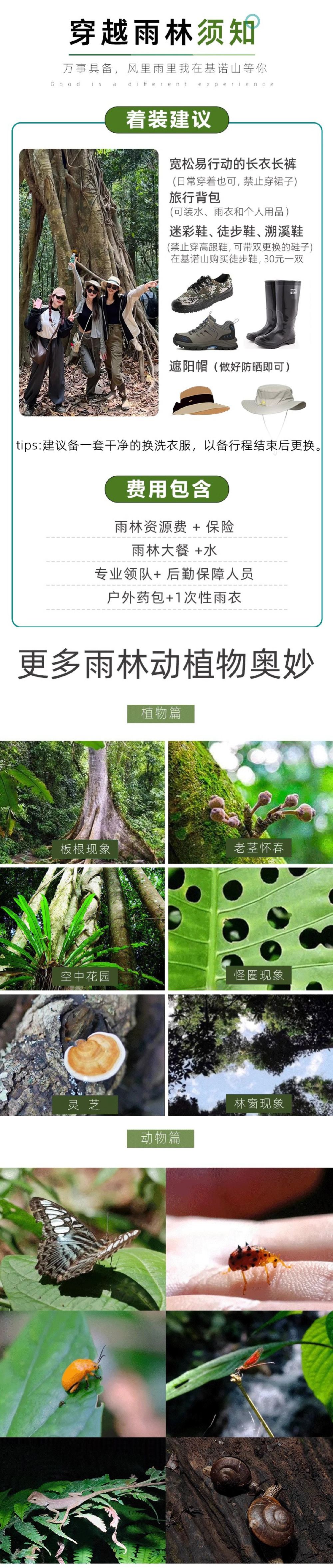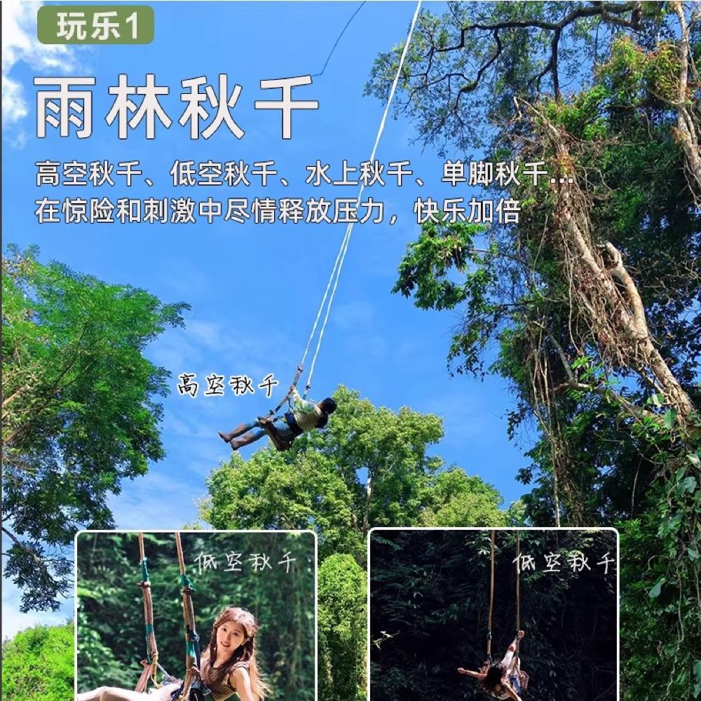 费用包含:含接送(只限含接送套餐)、雨林资源费、专业户外向导、矿泉水、保险、雨林餐、体验活动:高空秋千、单索秋千、水上秋千、攀爬绞杀榕树(树降体验)、竹筏漂流、画天然石彩妆、雨林动植物科普、沿水路抓螃蟹体验等(须应季)、向导会自备户外药包和一次性雨衣,有需要的时候可以免费使用;