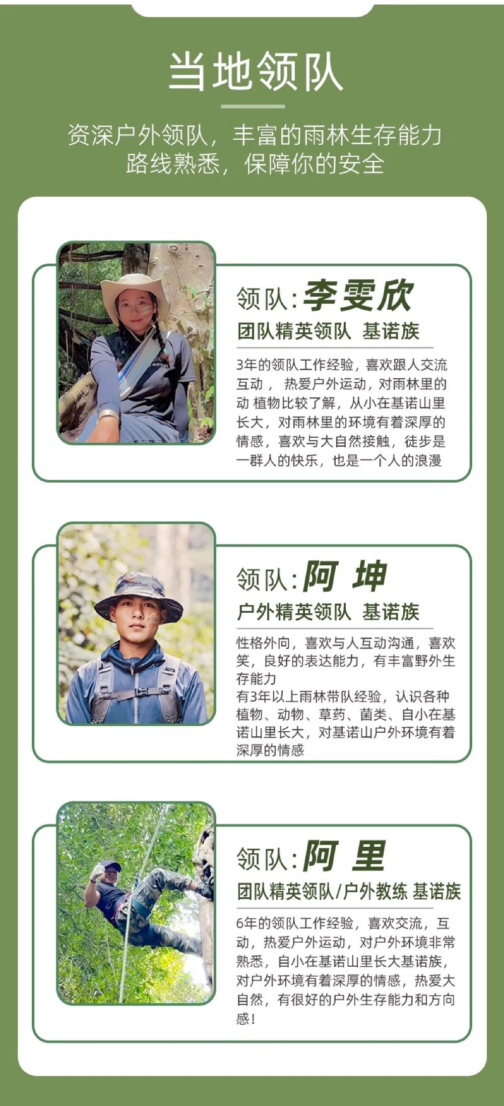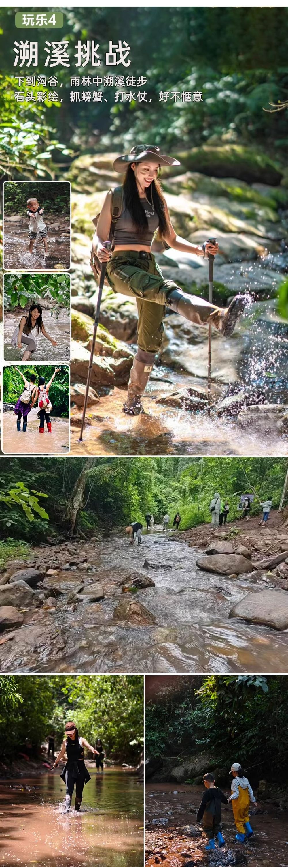 巴飘走的前行,只接待独立小团,高空/低空/单脚/水上秋千都很丰富, 树降(天然可攀爬,无需借助扶梯)竹筏(全长50米,目前基诺山最长竹筏漂流)/射箭 等),线路相对比较轻松,适合带老人或者小朋友比较小的;雨季(每年4-10月)溯溪体验非常不错哦;