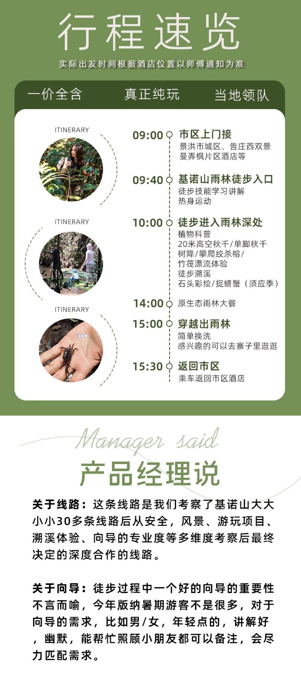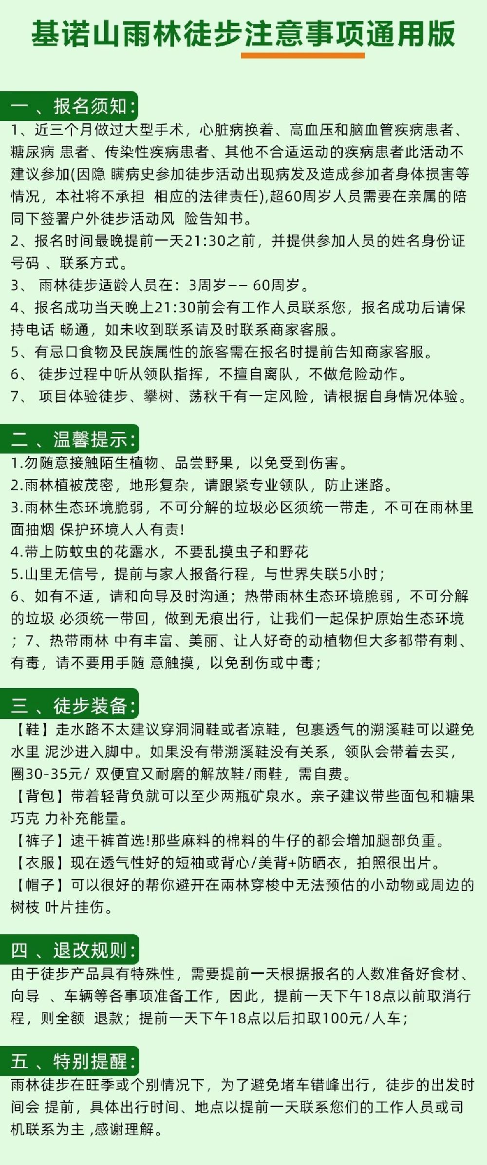 注意事项:此产品是基诺山雨林徒步,不是基诺山寨景区,A/B拼团套餐巴朵/么卓/新司土随机安排,独立团不指定情况下巴朵/巴飘/么卓/新司土随机安排(如果需要指定线路,请提前和客服说明即可)