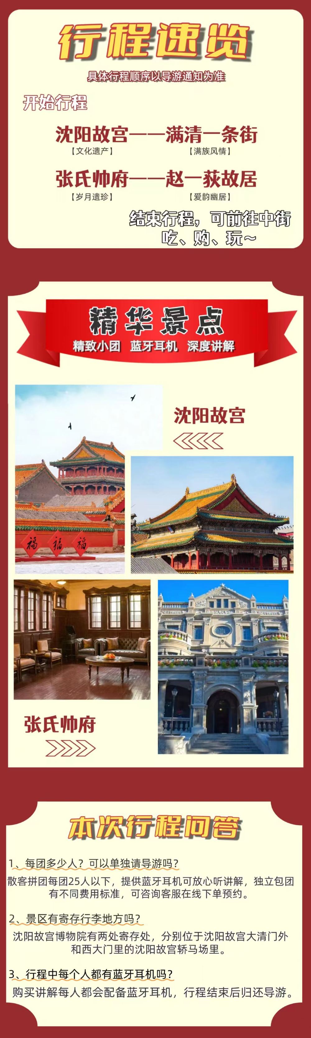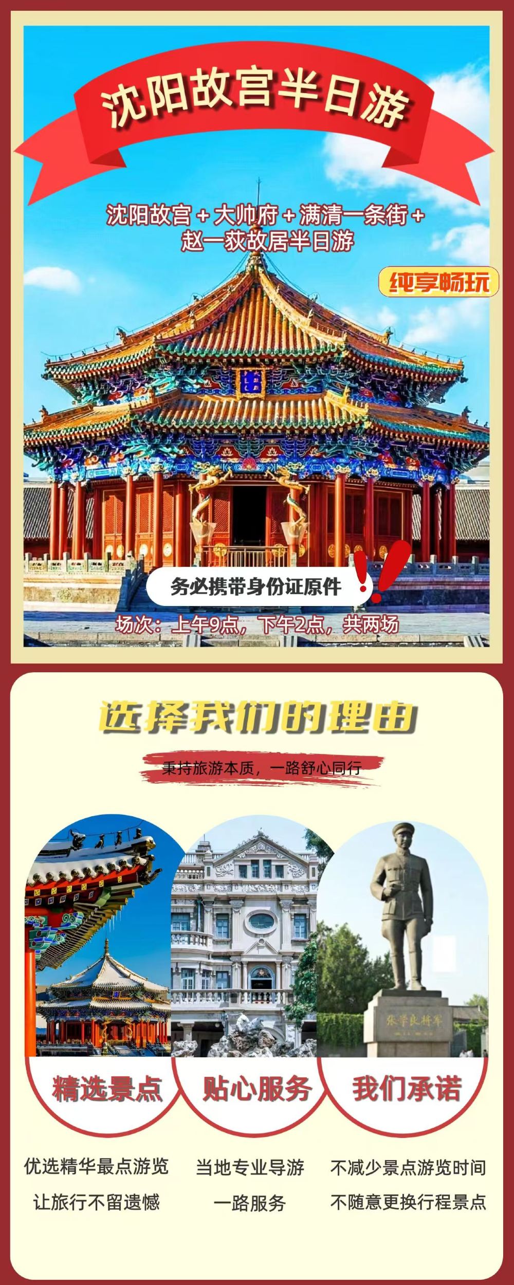 沈阳故宫+大帅府+赵一荻故居景区+人工导游讲解一日跟团游【精选景点,贴心服务,精讲讲解,深度纯玩,售后保障,售前服务,专业导游,我们承诺】