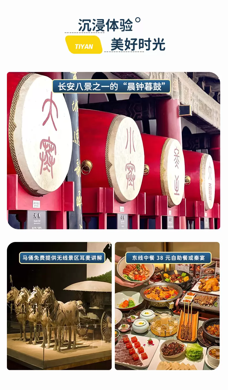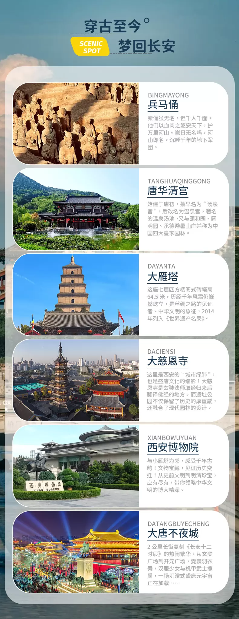 ★★春节期间线路不再赠送《千古情》演出★★1、西安博物院如遇景区限流未预约成功,改为八路军办事处;2、大唐不夜城交通管制,放就近地点游客自行前往,游客游览完毕后,需自行返回酒店。或取消游览直接送回酒店,敬请谅解。3、行程内所含赠送项目及表演<><<汉服体验>>等,过节期间无法观看体验,敬请谅解!