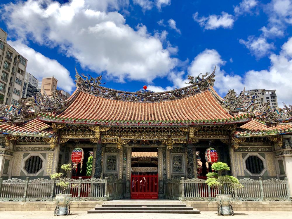 ▲ 龙山寺: 艋舺(今萬华)是台北开发较早的地区,而龙山寺是当地居民信仰与活动的中心。广场景点有趣,地板石板部分来自早期移民渡海用的压舱石。正殿供奉观音菩萨,二战时殿堂毁于炮火,神像却完好,令人敬佩。天井香炉上有“憨番抬庙角”雕塑,两侧钟鼓楼早晚敲响。后殿与殿神像众多,达百余尊,人物石柱造型活泼,别具特色。外墙还有“红毛番吹法螺”石雕,趣味十足。龙山寺收藏艺术珍品丰富,节庆活动热闹,值得一游,感受文化与信仰的魅力!