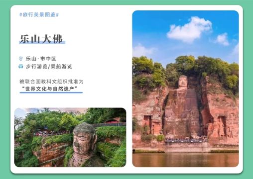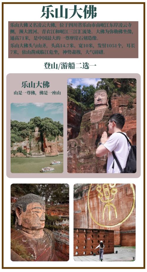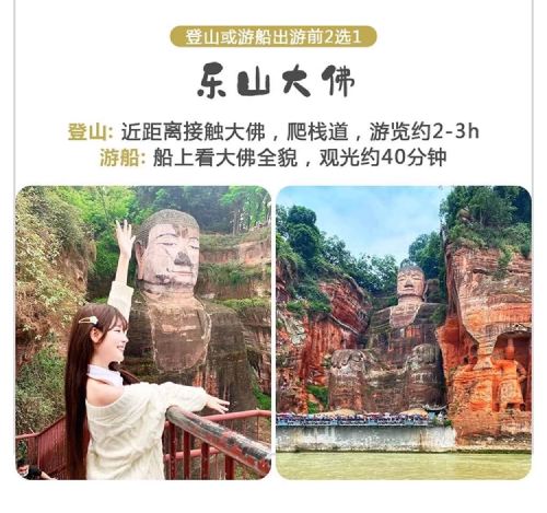 景点说明:乐山大佛景区游览可登山/船游二选一,登山游览时间2-3小时,从景区门口徒步到山顶,可近距离看到大佛佛头,若栈道开放也徒步至大佛脚下,近距离感受大佛的雄伟。游船约40分钟-1小时,游船可开到大佛正面,可直观看到大佛全身,与大佛合影。(:1.登山受角度影响无法正面看到大佛全身,但可与佛头近距离合影也可下到佛脚,游客可根据自身需求做选择,2.游船是当天早上景区根据天气和水位情况决定是否开航,如果停航则直接默认改为登山游览)