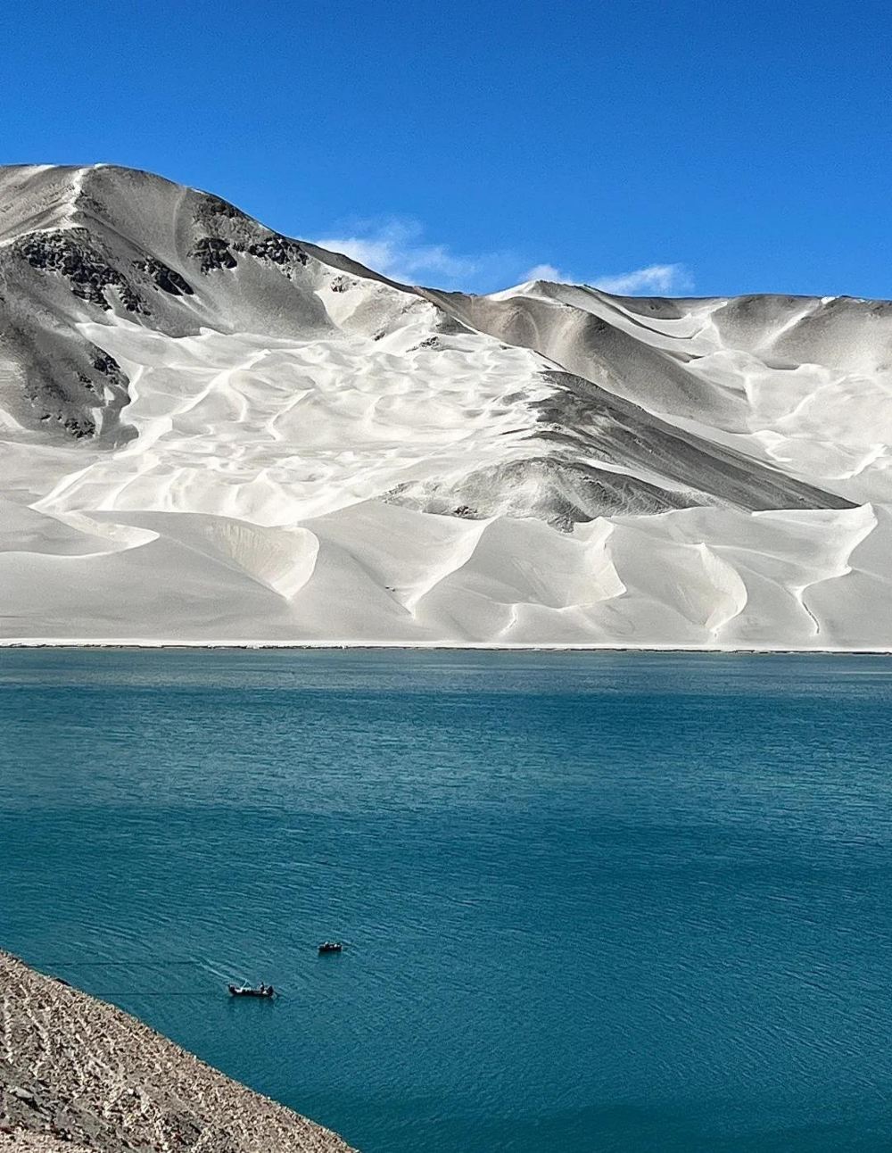 ▲ 银白色的沙丘与雪山相连,仿佛上帝撒下一把柔纱,风一吹就成了流动的月光 湖水像蒂芙尼蓝的宝石,倒映着沙山和雪峰,清澈到分不清现实与镜像!