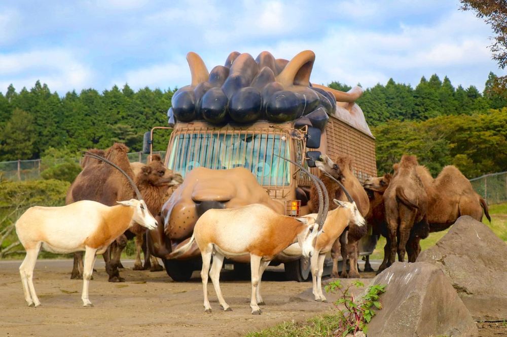 ▲ 九州自然动物园:以放养方式为特色,可搭乘园内专车穿越“野生区”,看见长颈鹿、斑马、水牛等动物在辽阔草原悠闲自在。