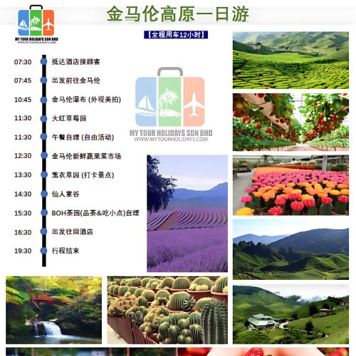 金马仑高原,马来西亚著名的避暑胜地,有许多值得推荐的景点和活动。推荐景点包括茶园(BOH 茶园)、草莓园(Big Red Strawberry Farm、Raju Hill Strawberry Farm)、薰衣草园、仙人掌谷、瀑布(Lata Iskandar 瀑布、Robinson Falls)和时光隧道博物馆。此外,还可以体验采摘草莓、参观蝴蝶园和蜜蜂园。