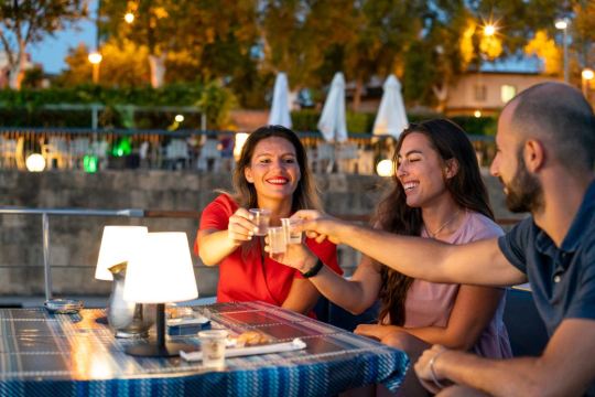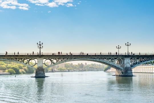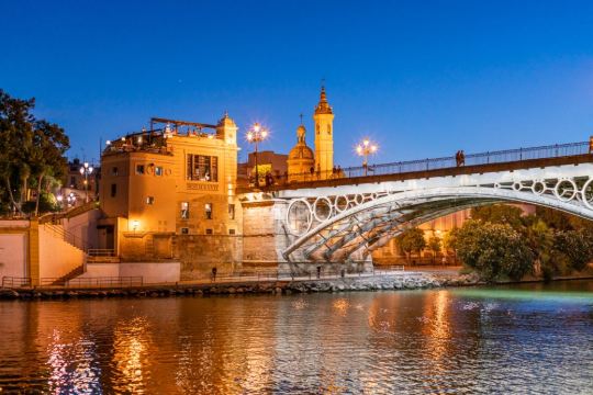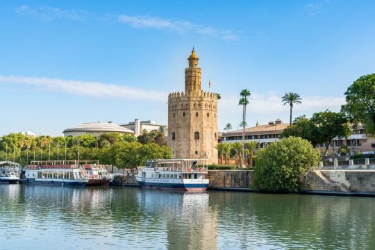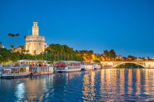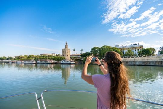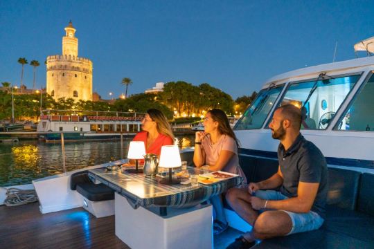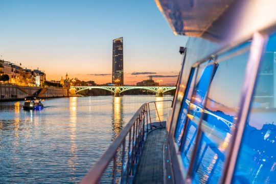 沿着瓜达尔基维尔河进行游船之旅(可选1.5或2小时套餐)。一边欣赏这座城市的美景,一边品尝迎宾饮品和享用美味的传统西班牙餐点。游览瓜达尔基维尔河,欣赏历史和现代塞维利亚的不同建筑地标。黄金塔(Torre del Oro)、 Real Maestranza斗牛场和Puente de Triana;穿过历史悠久的特里亚纳桥(Puente de Triana)。游船提供音乐播放和酒吧服务,舒适的甲板和宽敞的阳光露台。