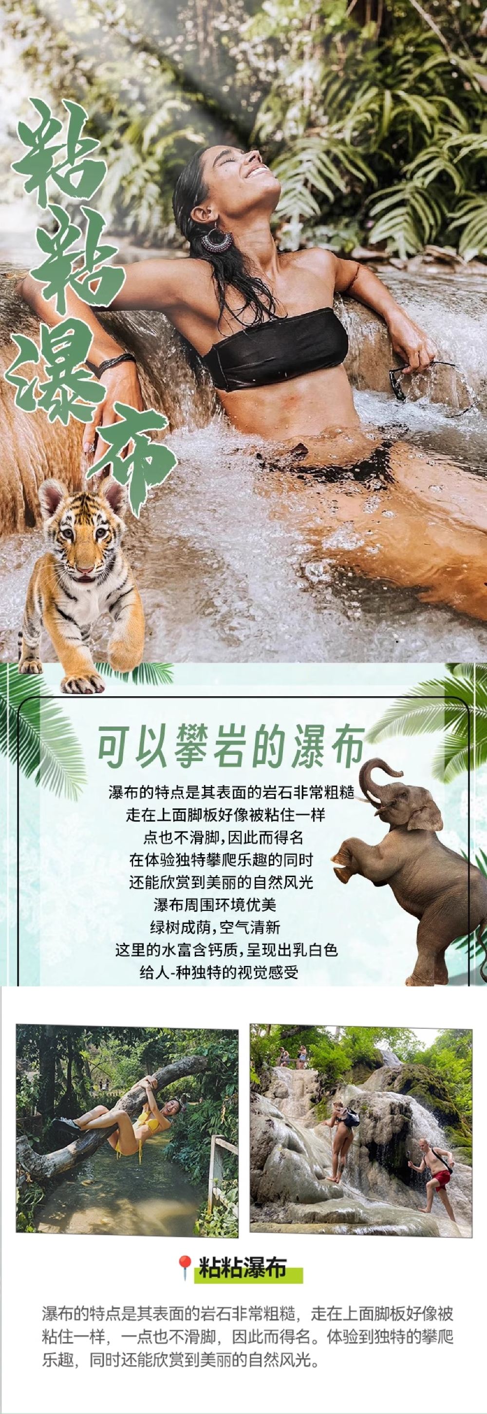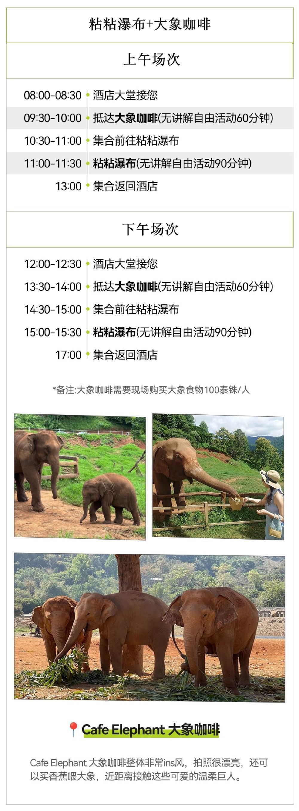 A套餐:粘粘瀑布+大象咖啡 上午 :08:00开始接人 -大象咖啡自由活动:60分钟 (自理门票50泰铢/大象食物自理)-粘粘瀑布自由活动:90分钟, 13:00返程回到市区大约14:00