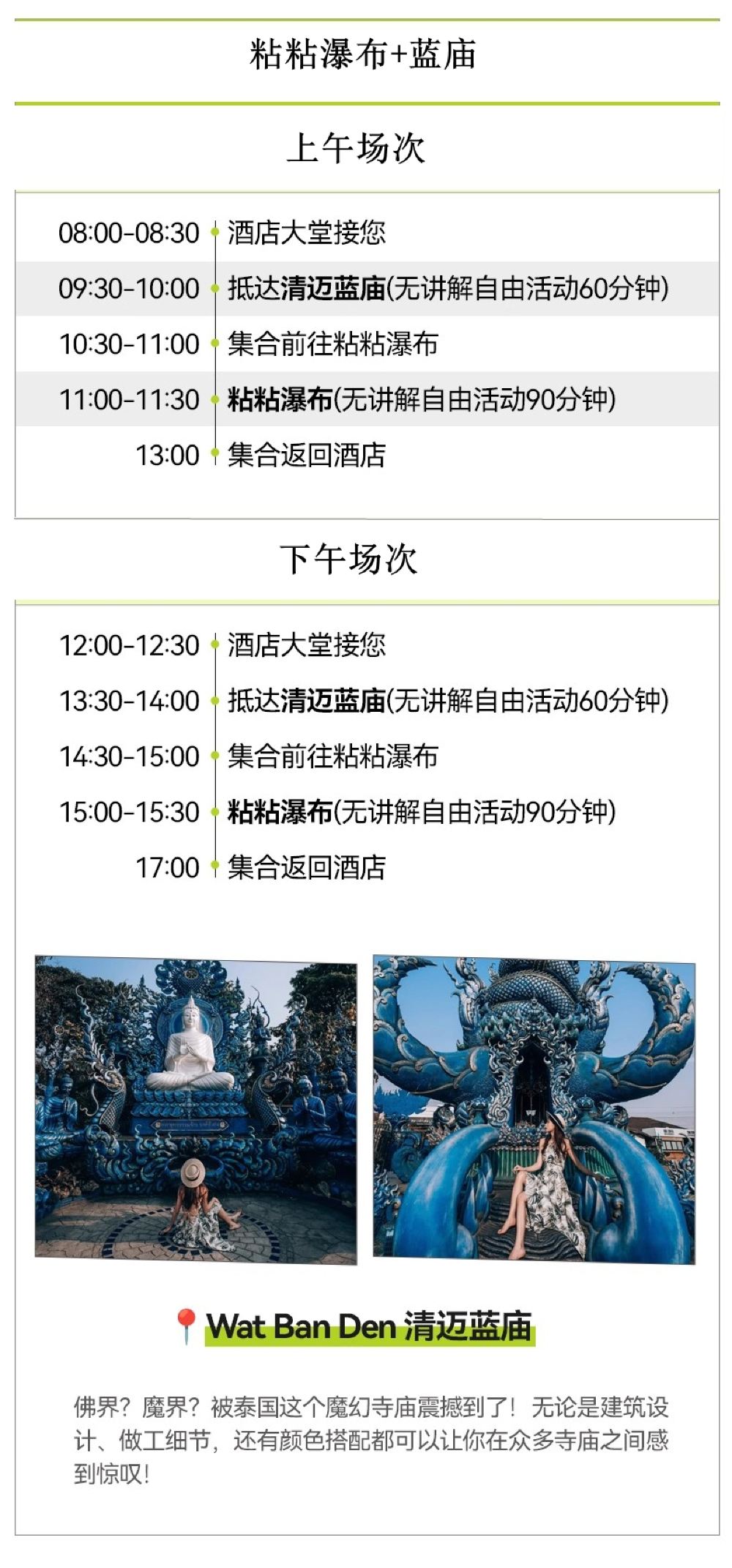 E套餐:粘粘瀑布+蓝庙 下午 :12:00开始接人 -蓝庙自由活动:60分钟 )-粘粘瀑布自由活动:90分钟, 17:00返程回到市区大约18:00