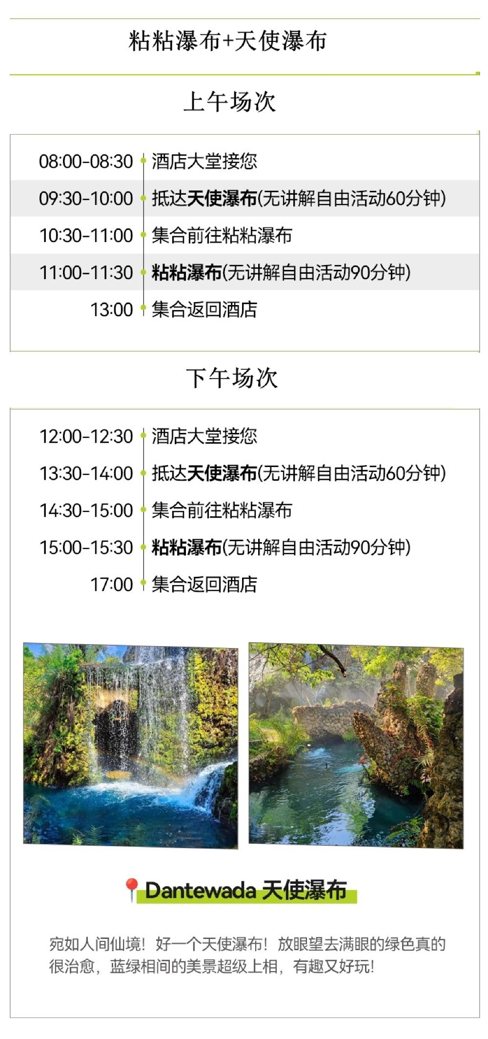 C套餐:粘粘瀑布+天使瀑布 上午 :08:00开始接人 -天使瀑布自由活动:60分钟 )(含门票)-粘粘瀑布自由活动:90分钟, 13:00返程回到市区大约14:00