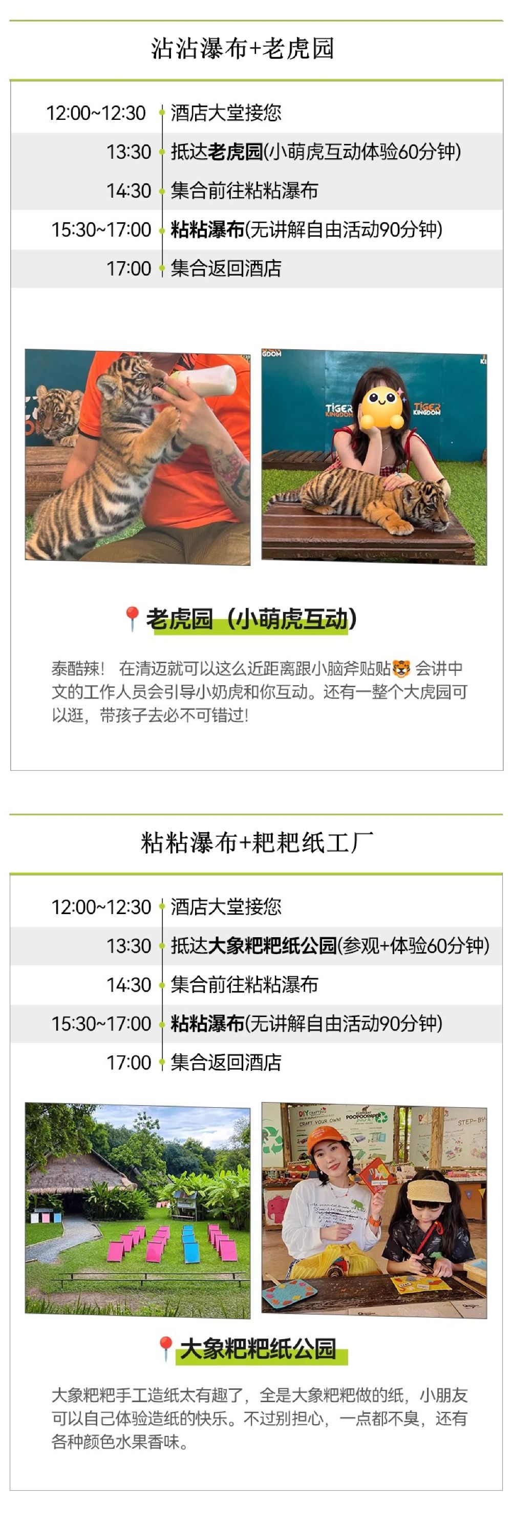 H套餐:粘粘瀑布+老虎园下午 : 12:00开始接人 -老虎园(小老虎)参观:60分钟 )(含门票)-粘粘瀑布自由活动:90分钟, 17:00返程回到市区大约18:00