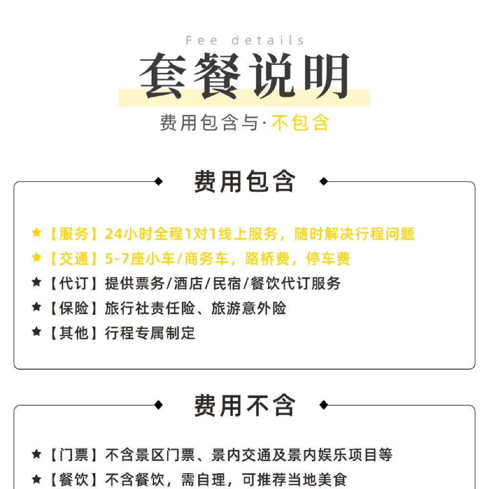 2.服务:司机带队服务(无导游) ;全程微信线上助理服务,随时解决行程问题