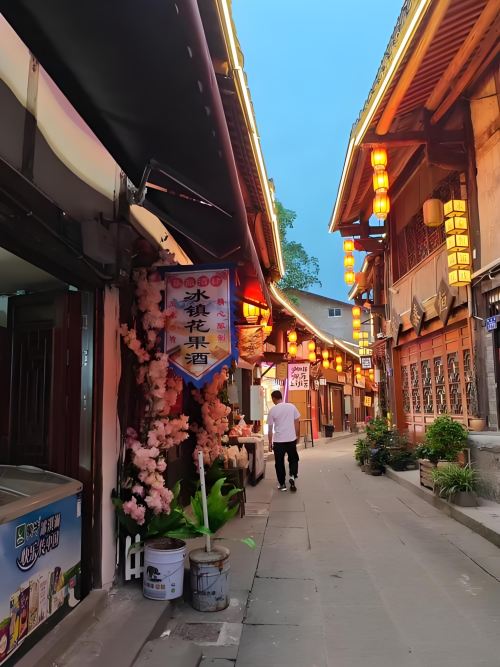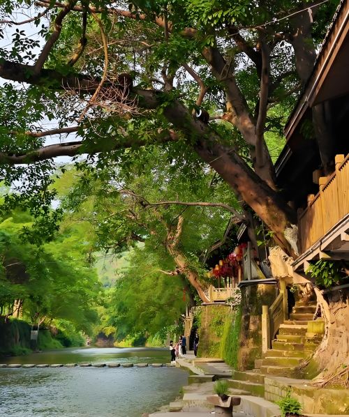 ▲ 古镇街道用青石铺筑而成,顺黑水滩河长约 400 米。街道两旁店铺多为木竹结构,以木斗为骨架,或以木板为墙,或以竹编篱笆糊粉为墙,屋顶多为硬山顶或悬山顶.