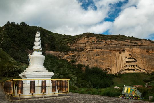 ▲ 千佛洞有 500 多个摩崖佛塔窟龛,规模宏大。从图片中可以看到,众多窟龛密密麻麻地分布在崖壁上,展现出古代工匠的精湛技艺和佛教文化的深厚底蕴。