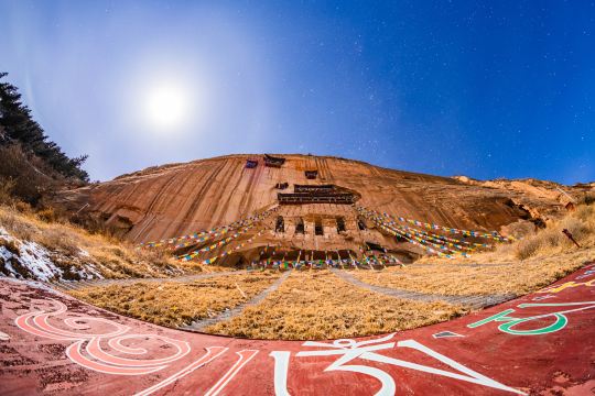 ▲ 这是马蹄寺代表性的景观之一,属于普光寺。它上下五层二十一窟,呈宝塔形排列,内有佛殿,外有回廊,共开内外窟龛达 49 孔之多,造型奇特,在悬崖峭壁上显得尤为壮观。