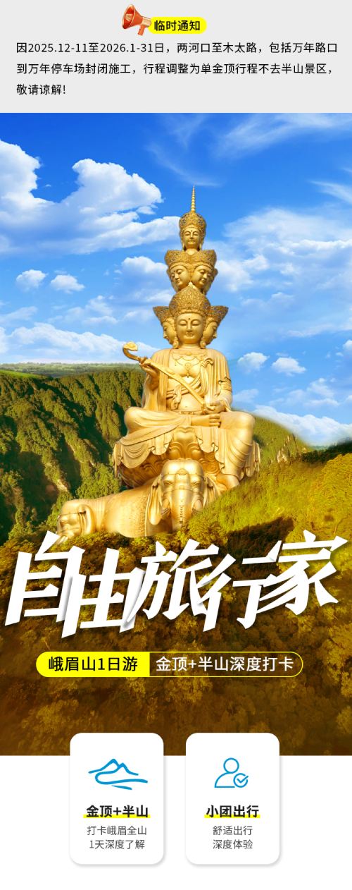 峨眉山一日游【15人小团 金顶+峨眉半山 特色午餐】【[高端体验]可选“索道快速通道 上金顶” 免去高峰时期长时间排队困扰 避免景区人挤人】