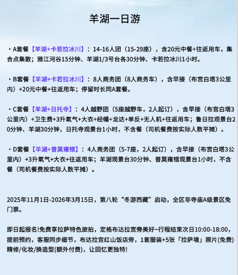 本产品AB套餐去卡若拉冰川,套餐C去日托寺,套餐D去普莫雍错。