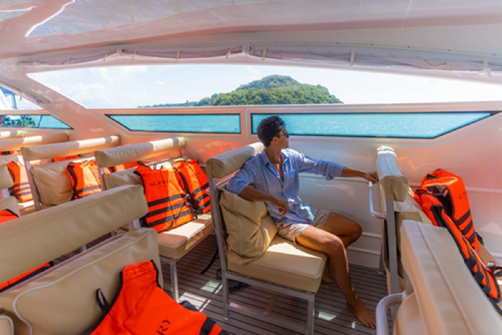 ▲ 乘坐长尾船游览天堂湾,观赏四周高耸悬崖和洞穴,到达燕窝洞,这也是一个有名的浮潜点,水晶搬清澈的海水,还有各种鱼类和海底珊瑚