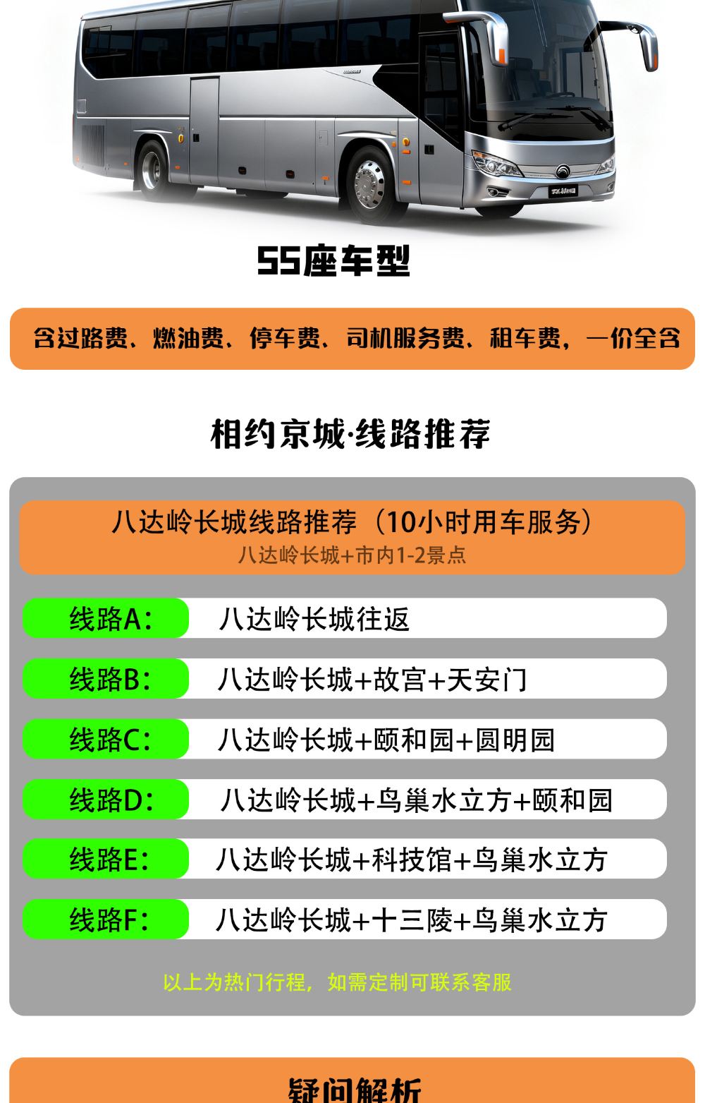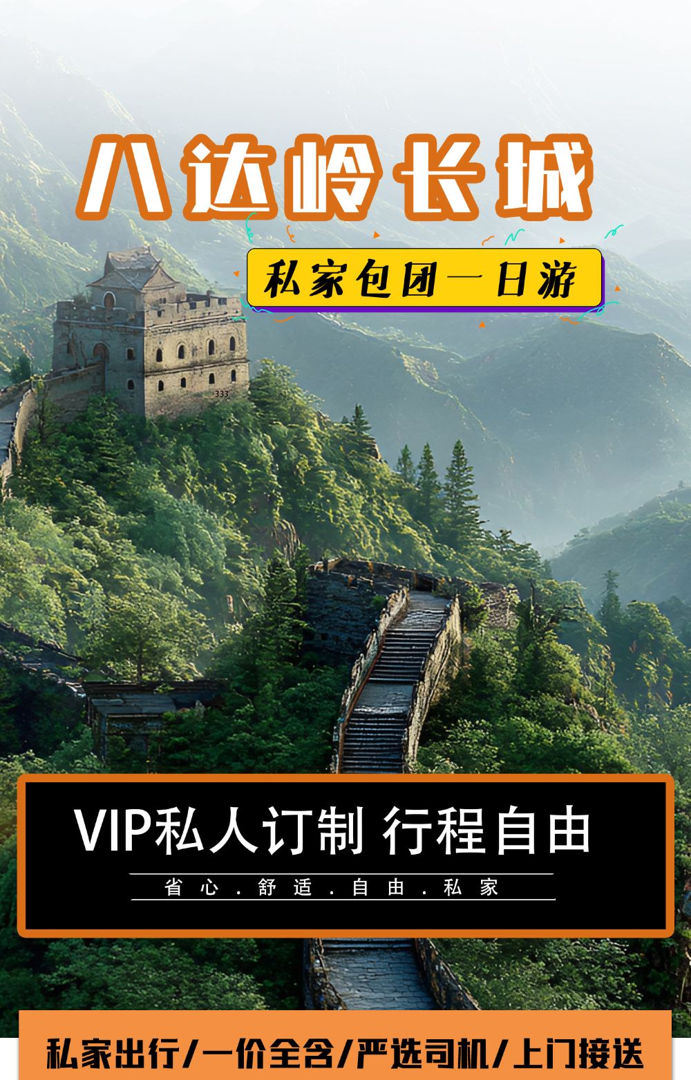 【1】随时出发,可为您订制线路,长城线路,市内套餐任您选择,一日游,专车+导游服务。