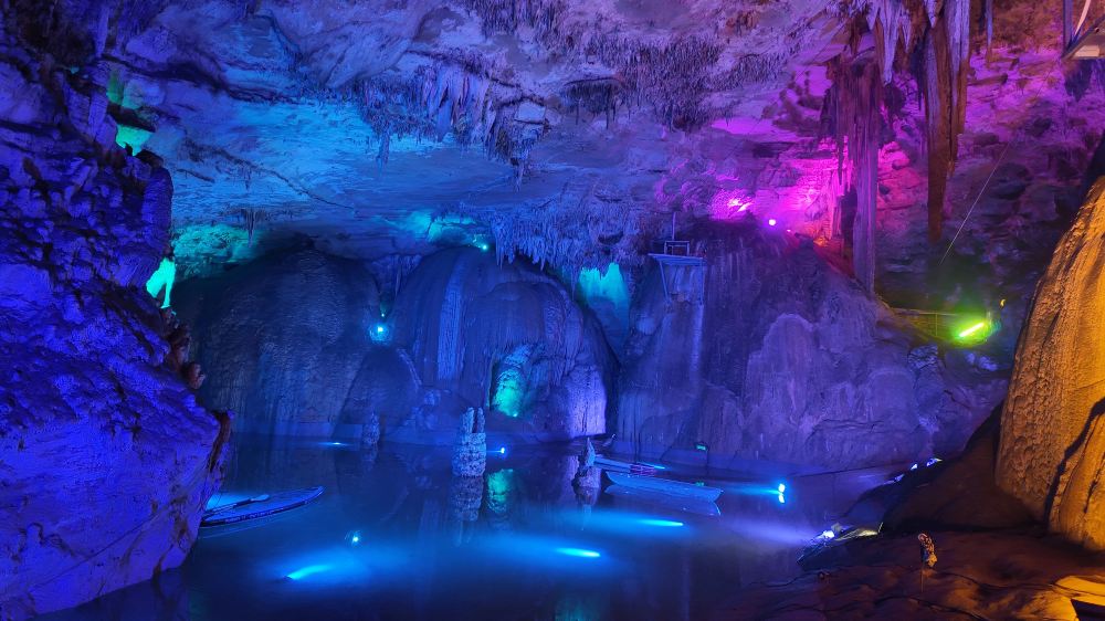 ▲ 幽暗的溶洞环境中,一束特制灯光聚焦在天然钟乳石或水潭上,折射出晶莹的海蓝色光晕,如同悬浮在黑暗中的 “宝石”