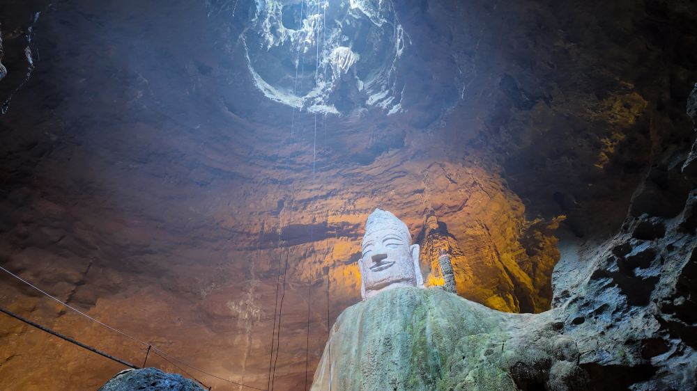 ▲ 上方是洞口自然天光倾泻而下,若恰逢天气适宜,可见淡金色丁达尔 “佛光” 穿洞而过;中间视角沿 60 米垂直绳索向下延伸,一名穿戴专业安全装备的游客正缓缓崖降,身影与洞壁深色岩石形成鲜明对比;下方洞穴深处,32.8 米高的石佛在暖黄色灯光映照下轮廓庄严,佛身细节与周围嶙峋的钟乳石交织,整体氛围兼具探险的刺激感与人文景观的神秘感,仿佛 “与神明隔空对视” 的场景具象化。