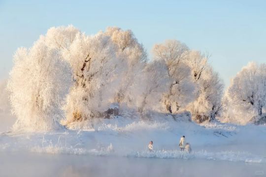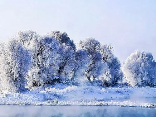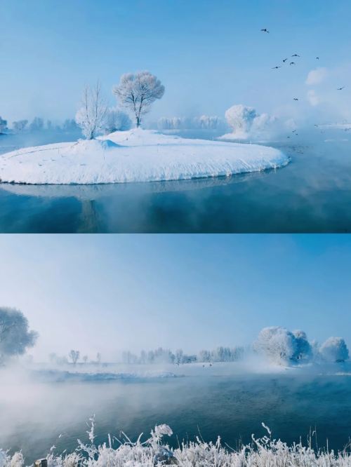 ▲ 近处白雪覆盖的平坦岸堤,远处树木银装素裹,林间氤氲着淡淡的白色雾气。