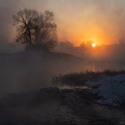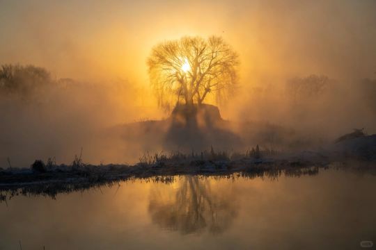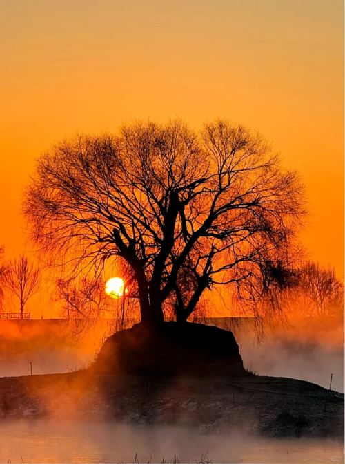 ▲ 一株孤树被冰雪包裹,落日的金红色光芒穿透树影,洒在江面与岸边。 意境表达:空旷的江面上,孤树与落日相映,勾勒出孤独却温暖的美感,视觉冲击力。