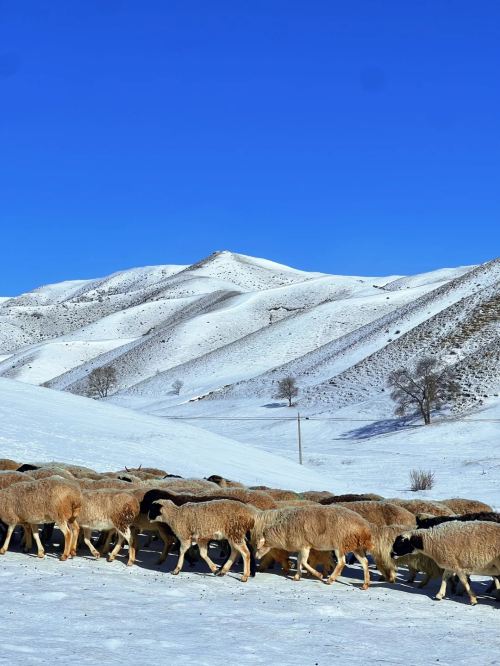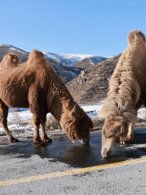 ▲ 近景是两只高大的骆驼,身披厚实的冬毛,正在低头进食或休憩;背景是连绵的雪山,开阔的土地覆盖着薄雪,兼具戈壁的苍茫与冬日的纯净。
