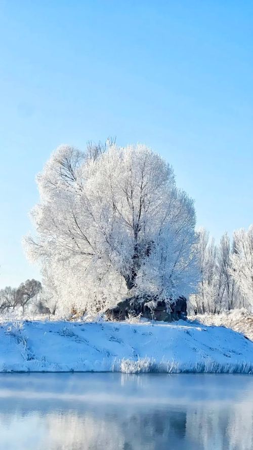 ▲ 万千琼枝玉叶,银装素裹。树木的枝干被洁白的霜花层层包裹,每一根枝条都晶莹剔透,宛如珊瑚盛开,又似梨花满树,将冬日的荒原装点成梦幻的冰雪童话世界。