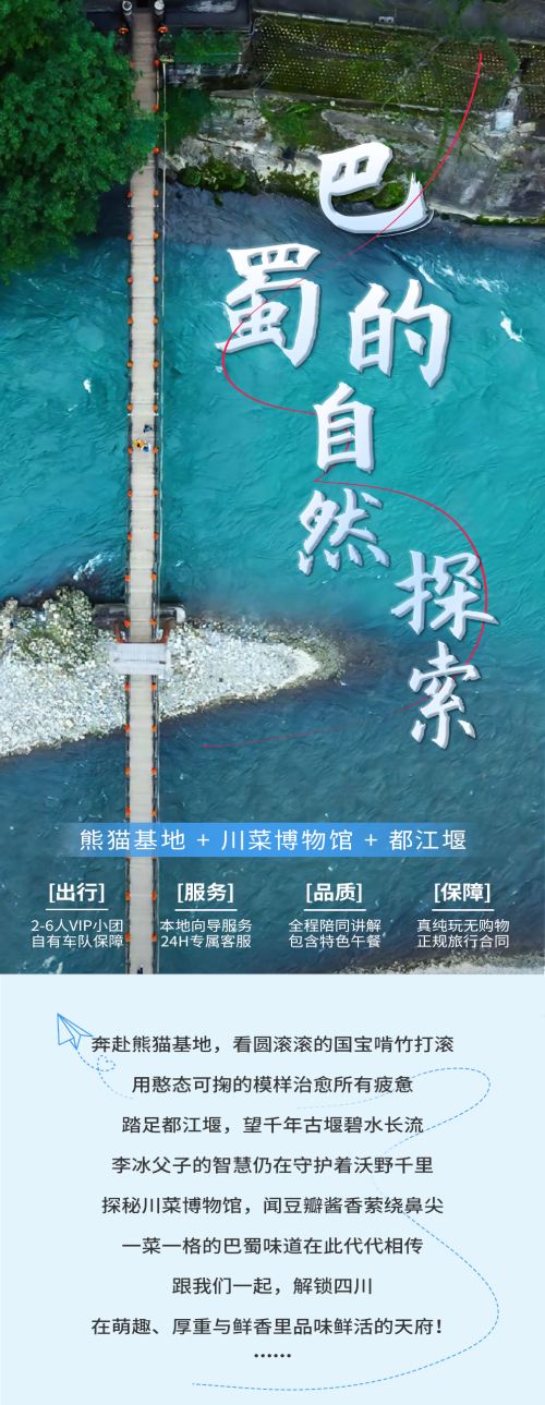 【成都大熊猫基地+川菜博物馆+都江堰景区】2-6人纯玩一日游【精品小团,深度自在:2-6人纯玩小团,告别拥挤喧嚣,全程享受宽松自由的旅行节奏。】