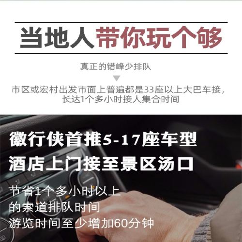 ▲ 【特别提醒:20人团是云谷上玉屏下的,6人团是玉屏上云谷下的,主要的区别是人数不同,其次玉屏上其中西海大峡谷要去的话必须要往返坐小火车,云谷上的其中西海大峡谷是走下去走单程小火车上来,(小火车的费用都是自理,单程100元/人】 法定节假日期间发团人数可能会增加 (20人团增加到25人左右,2-6人团增加到8人左右);本发团时间以提前一天通知为准:节假日期间由于道路堵赛,汤口游客实际情况有可能会无法提供接送服务,故请尽量入住到换乘中心周边,或者到时候需要自行前往集合地点集合;
