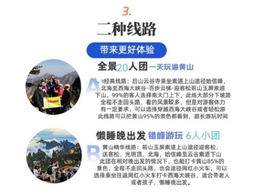 ▲ 精致全景 20 人团:7:30 景交接送,8:30 云谷索道上山,游北海景区、西海大峡谷(可选小火车),登光明顶、鳌鱼峰,打卡迎客松,15:30 玉屏索道下山,16:30汤口散团,宏村 / 市区接送1人即发。 轻奢 2-6 人团:2人起发(如购买一单出行人只有一人,还需有其他购买人可以拼团,否则无法成团),8:30 玉屏索道上山,深度赏迎客松,挑战百步云梯,穿西海大峡谷(可选小火车),天海用餐后登光明顶、游北海,15:30 云谷索道下山,16:30左右 汤口散团,市区 / 汤口接送,小团更灵活。