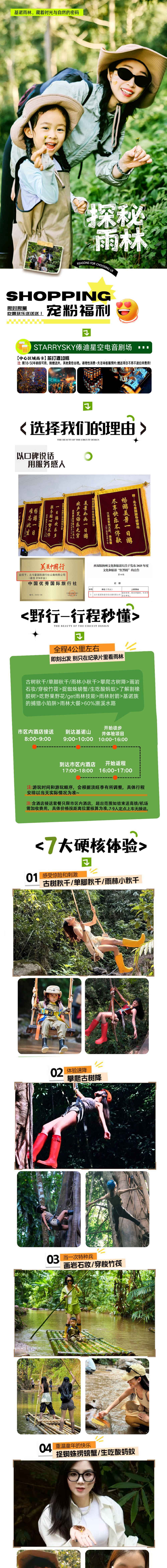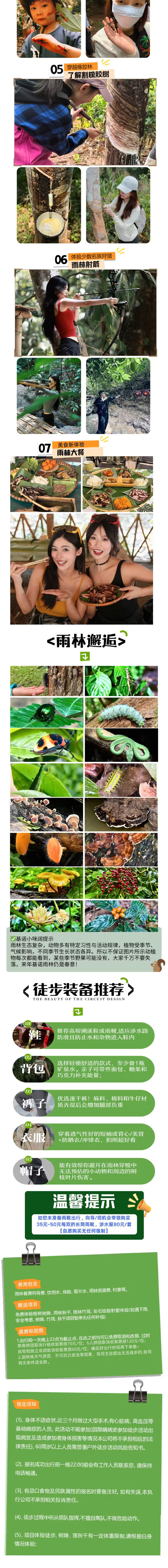 【特色体验】涵盖四大核心玩法:20 米高空古树秋千、单脚平衡秋千、古树攀爬速降等刺激挑战;雨林小秋千、捉蜘蛛捞螃蟹、尝酸蚂蚁野果的童趣野趣;岩石特种兵妆、竹筏穿梭、割橡胶、雨林生存技巧的文化技能;基诺族特色大餐、丁达尔光影大片的美食美景体验。
