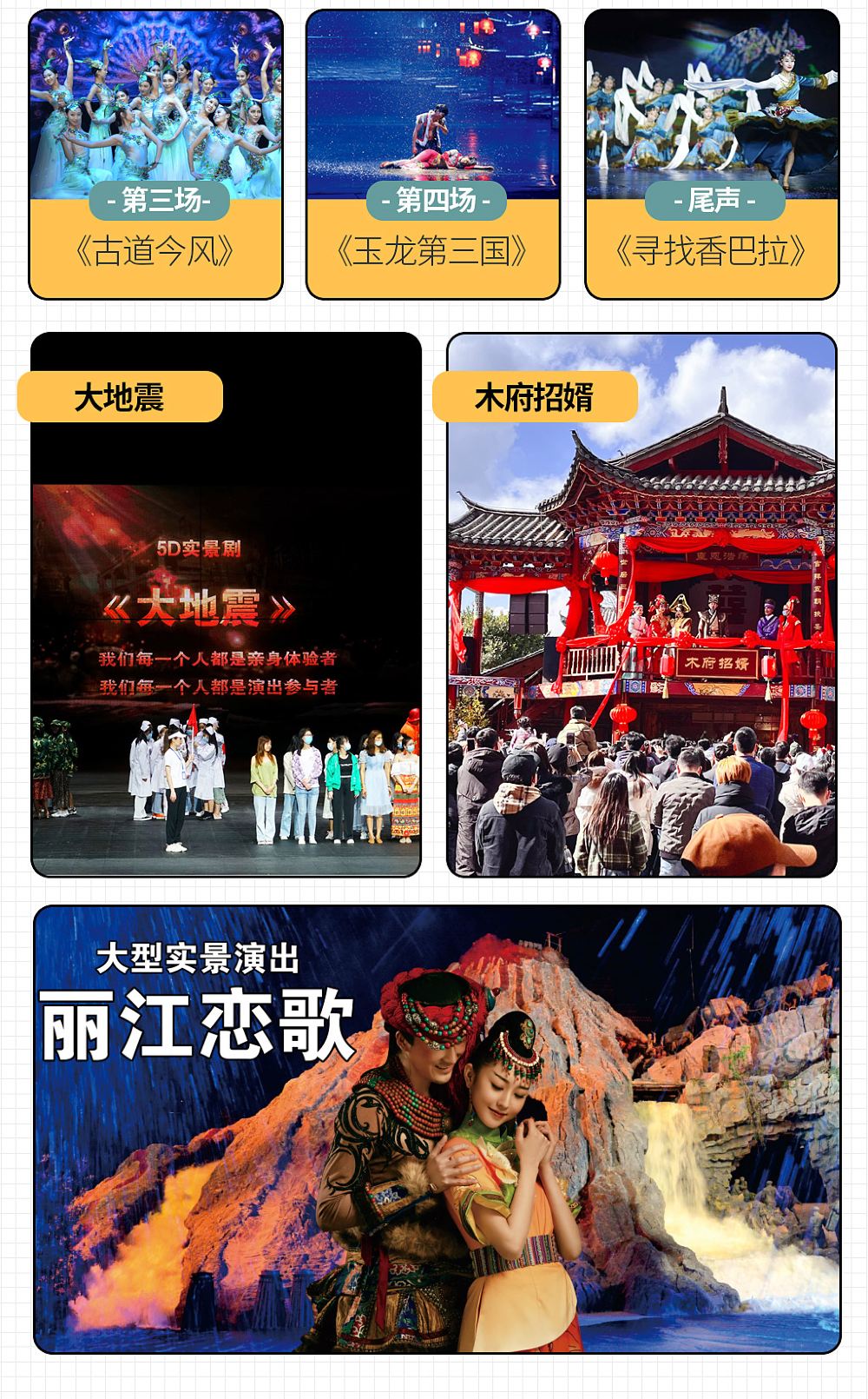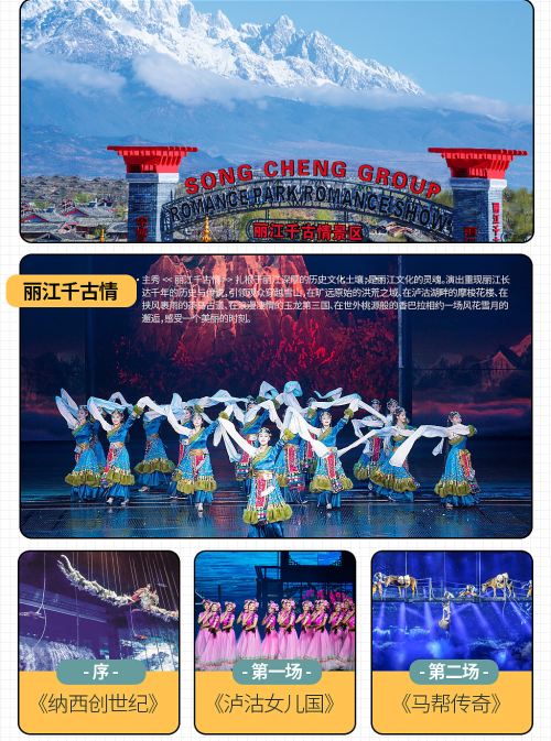 2、《丽江恋歌》《大地震》等演出,景区将根据天气、现场情况等进行场次调整或取消。演出不对票入座,先到先得,座满即止,不保证所有游客都能看到。