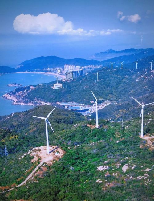 ▲ 上百部风机组成的风车阵耸立于果老山脉之巅,与蓝天碧海交织成一幅独特的风景画