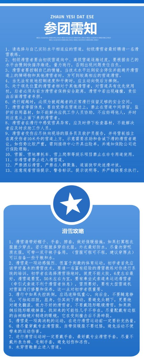 5、选择与自己实际水平相适应的雪道,要根据自己的水平量力而行,否则出现问题责任自负。