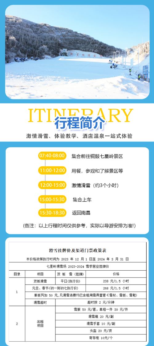 3、滑雪时长:平日3小时,元旦、春节2小时,超时1元/分钟;