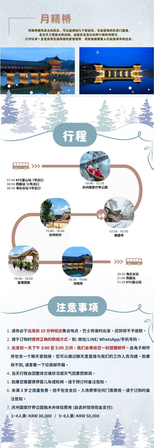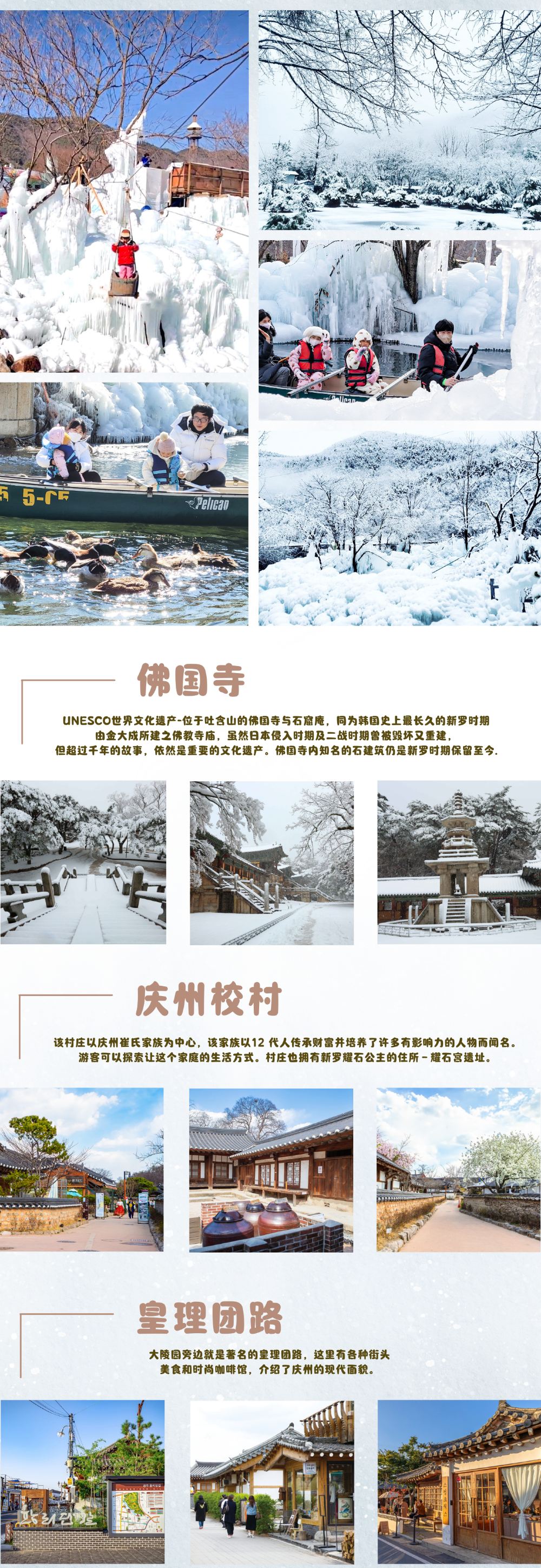 庆州冰冻王国之旅:国民疗愈公园+庆州古迹一日游 (釜山出发)【庆州国家疗养公园|白雪覆盖的仙境中,可体验雪橇、独木舟与冰川步道,拥抱冬日魅力,留下难忘回忆。】