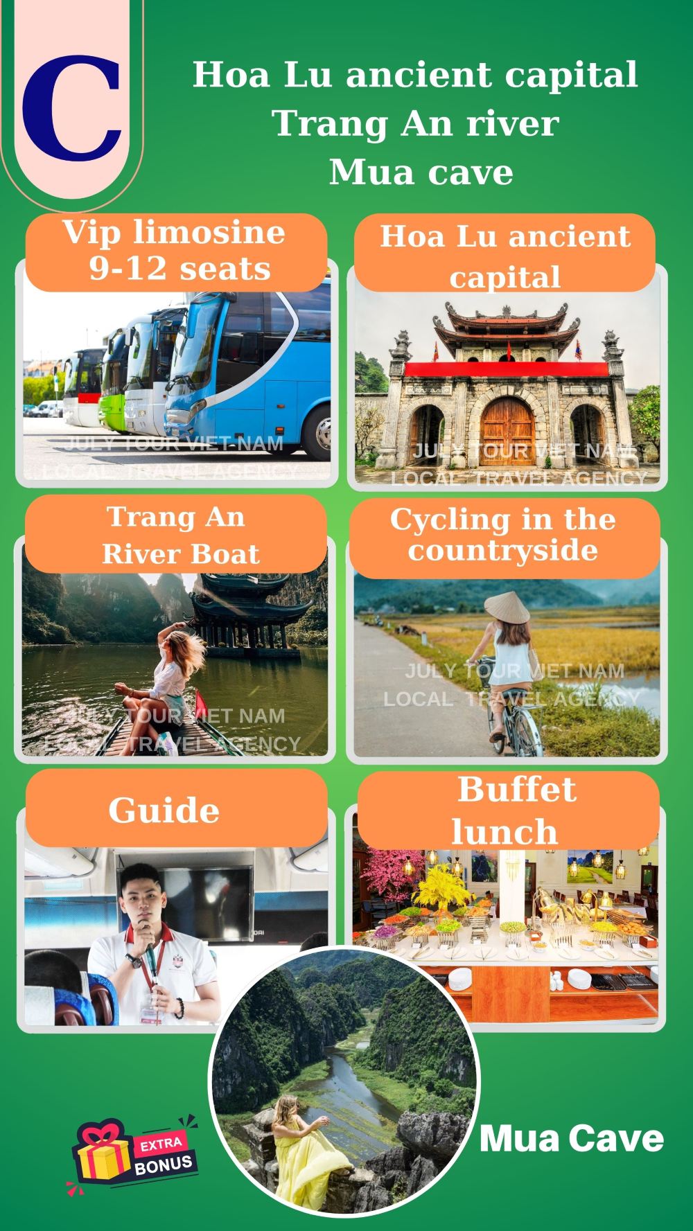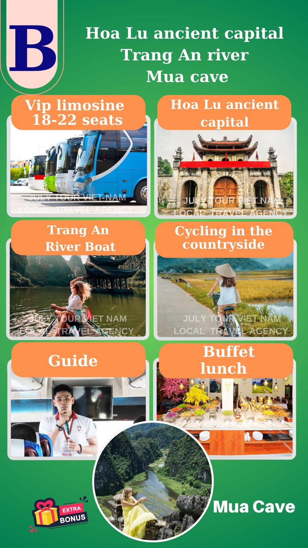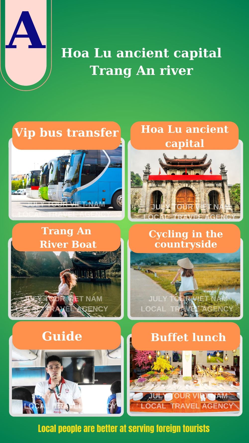 10:15: 到达华闾故都遗迹 Hoa Lu ancient capital,跟着导游进去参观了解历史。参观以后如果天气允许我们安排骑单车,游客在乡村田野边的道路骑着单车呼吸新鲜的空气。不参加骑自行车的客人可以自由在餐厅休息等其他客人。