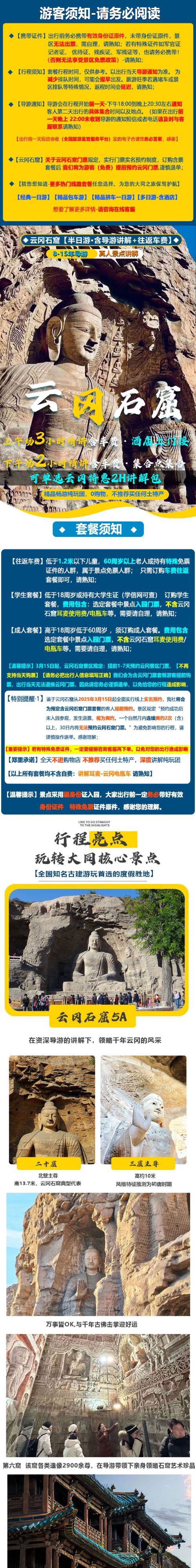 大同云冈石窟半日游:上午大咖3小时精讲-下午游玩3H讲解2H【[郑重承诺]纯玩畅游云冈石窟3小时+资深导游深度讲解,领略千年石窟的传奇魅力;】