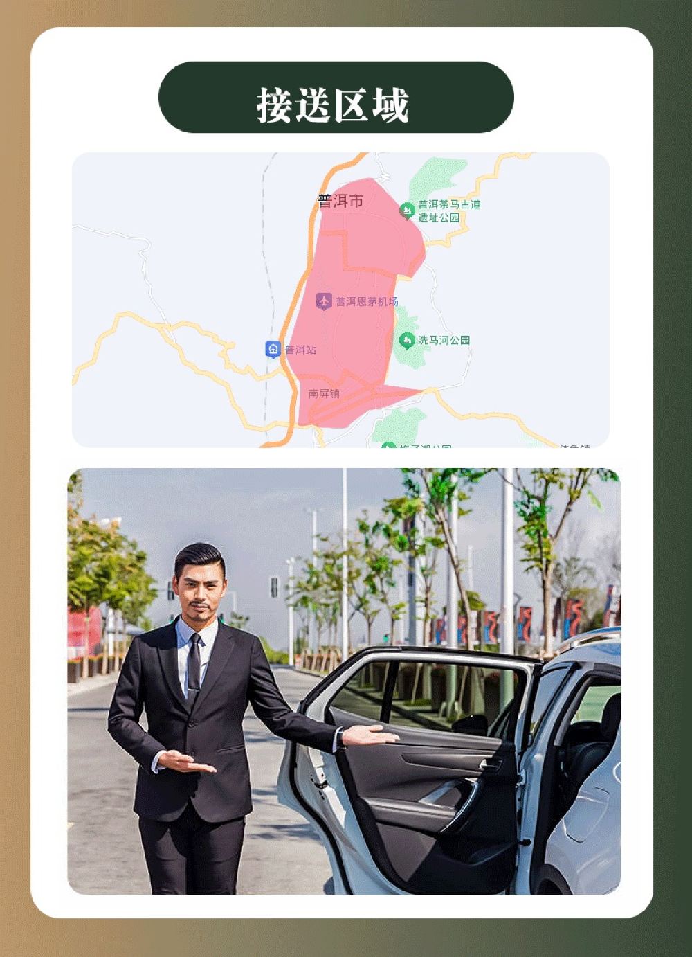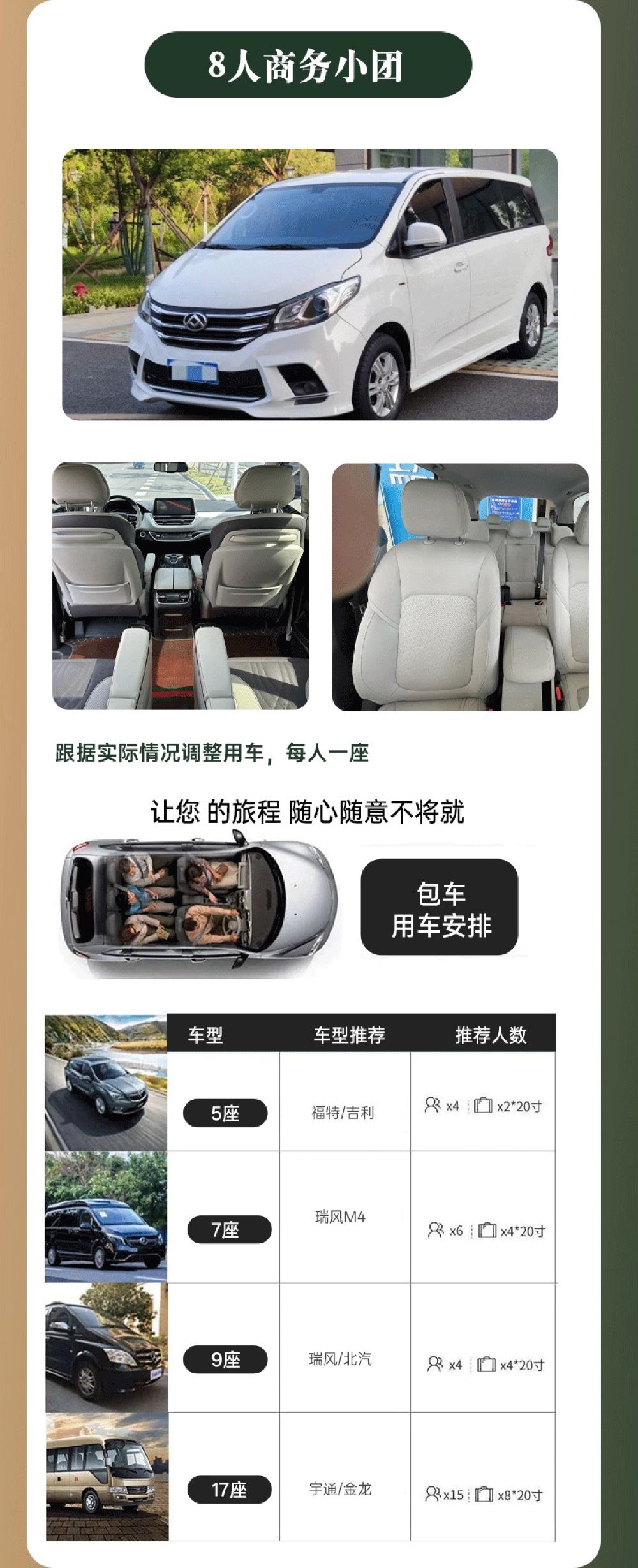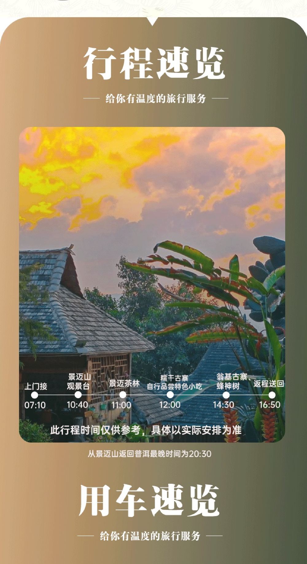 包车行程07:10 出发,上门接送,超出区域按实际收取50-100元费用,按实收取