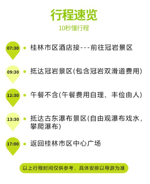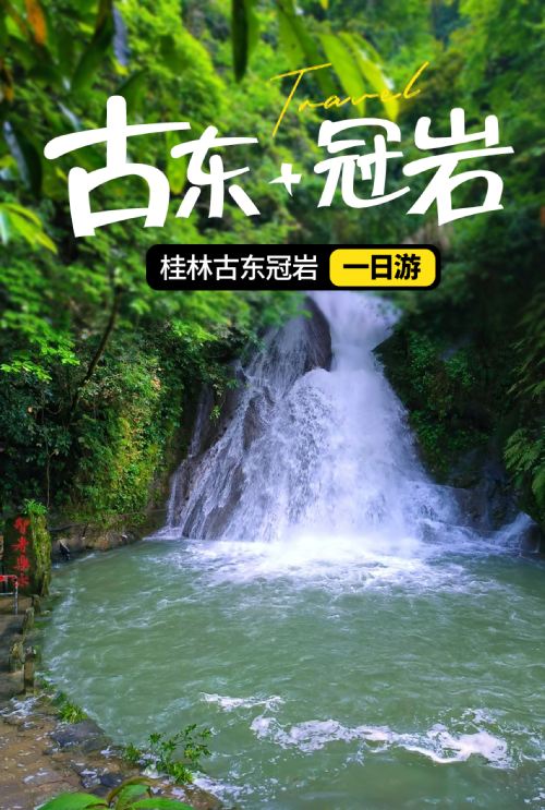 桂林漓江古东瀑布+冠岩景区一日游【[特色体验]可攀爬的瀑布,亲水零距离; 冠岩 “海陆空” 立体探险,丛林穿越、悬空吊桥、溜索多重体验】