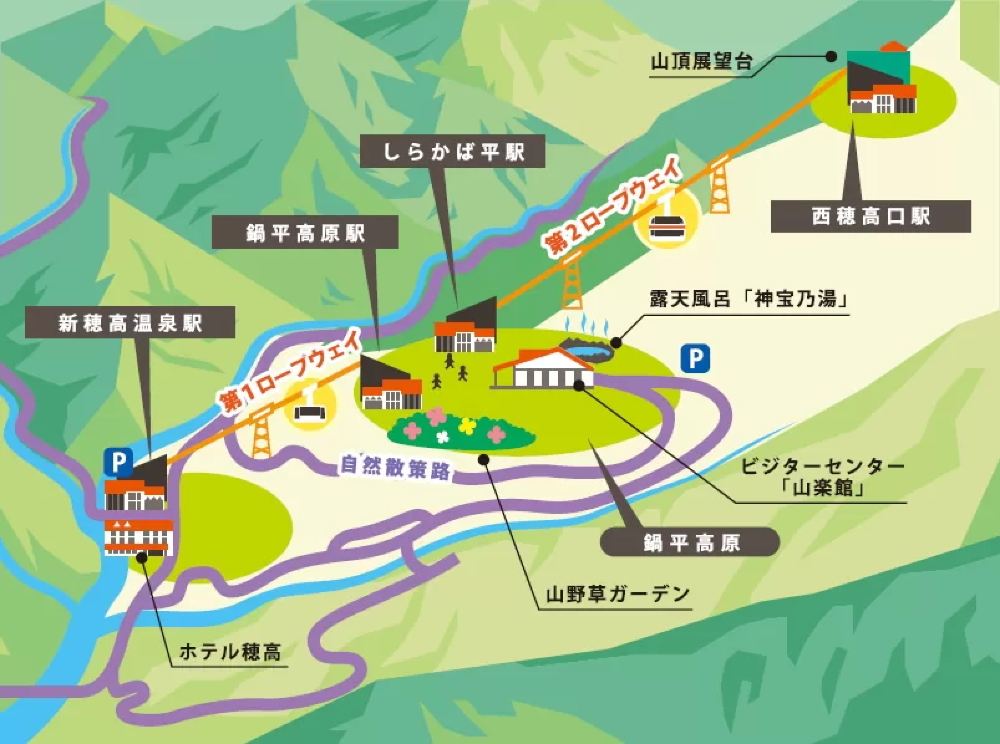 第一高空索道:从「新穗高温泉站」(海拔1117公尺)搭乘,约4分钟抵达「锅平高原站」(海拔1305公尺)。