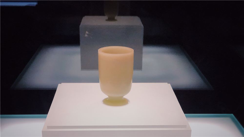 ▲ 白玉杯,质地温润,色泽纯净,在灯光下散发着柔和光泽,尽显素雅高洁之美。