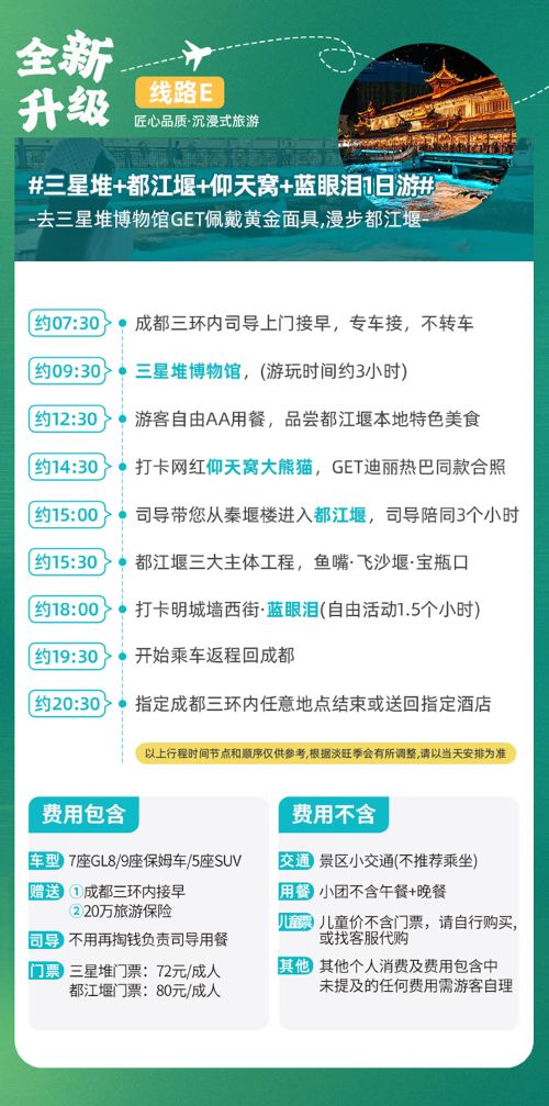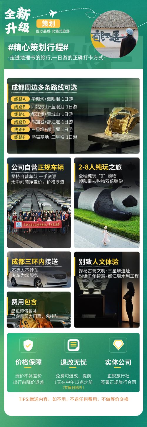 我们是成都本地实力旅行社(总社),深耕本地旅游市场十余载,公司自有正规营运车辆,车辆统一经营管理,拒绝转包和外调,核心一手资源,无中间商赚差价,所有车辆均为1-5年以内新车出行,本产品由自家直接发团,1人即可报名,2人以上保证正常发团,拒绝卖团转包,自家发团,服务质量jue对有保障!